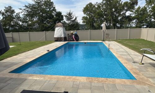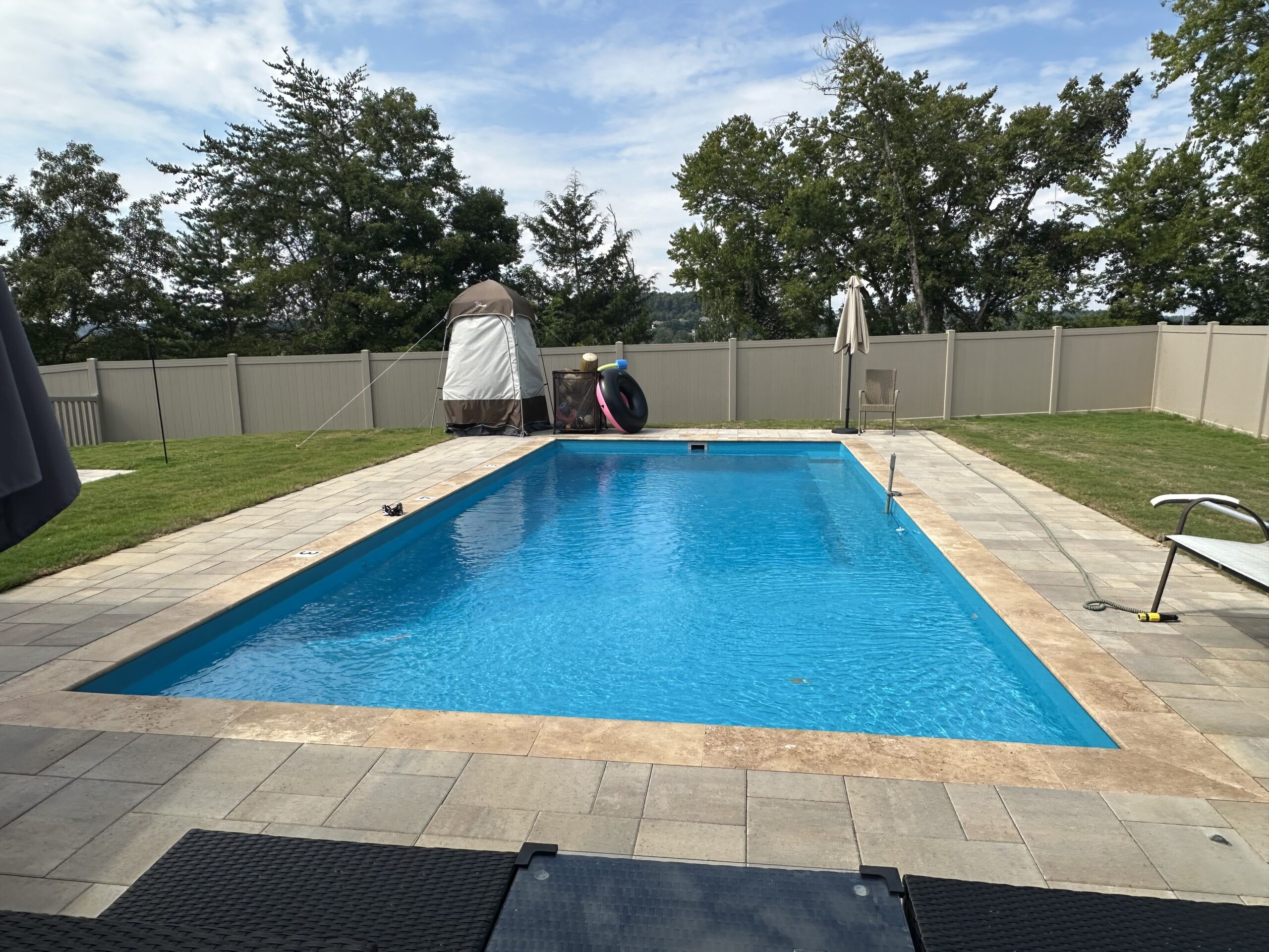 Rectangle – Bliss – 14′ x 30′ – Reef Blue by Imagine Pools. Noce Travertine coping with Belgard Dimension 12 pavers in Savannah.
