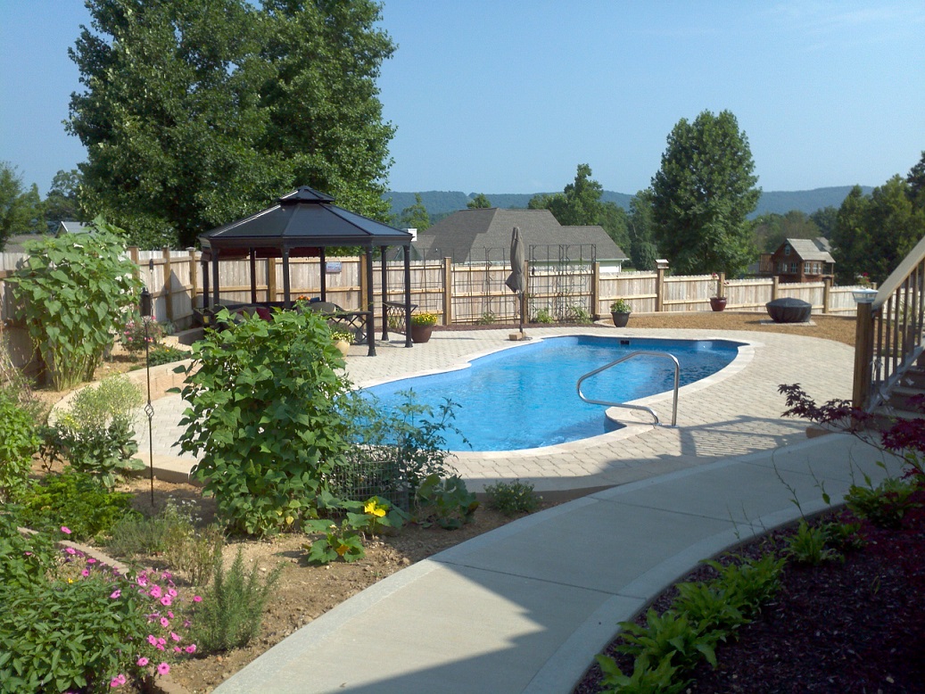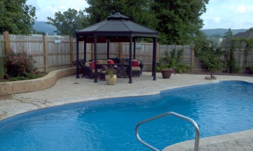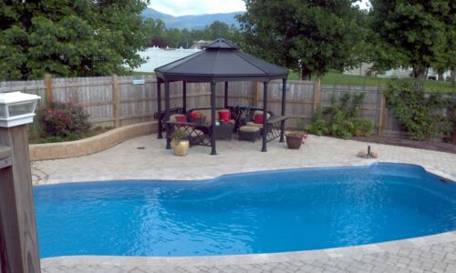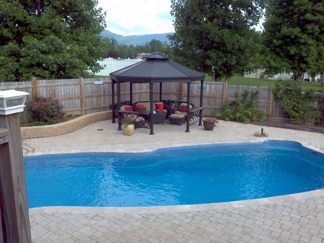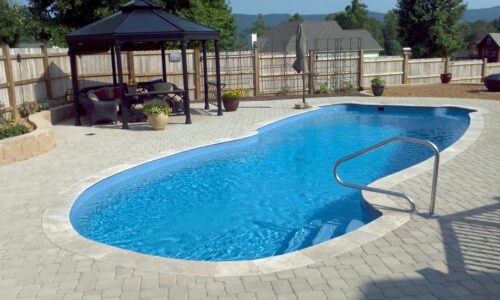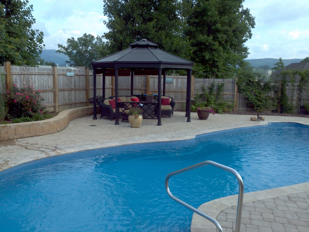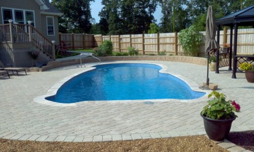Custom – Gulf Coast – 16′ x 40′ x 8′ – Travertine coping with brock pavers and a stacked block wall.