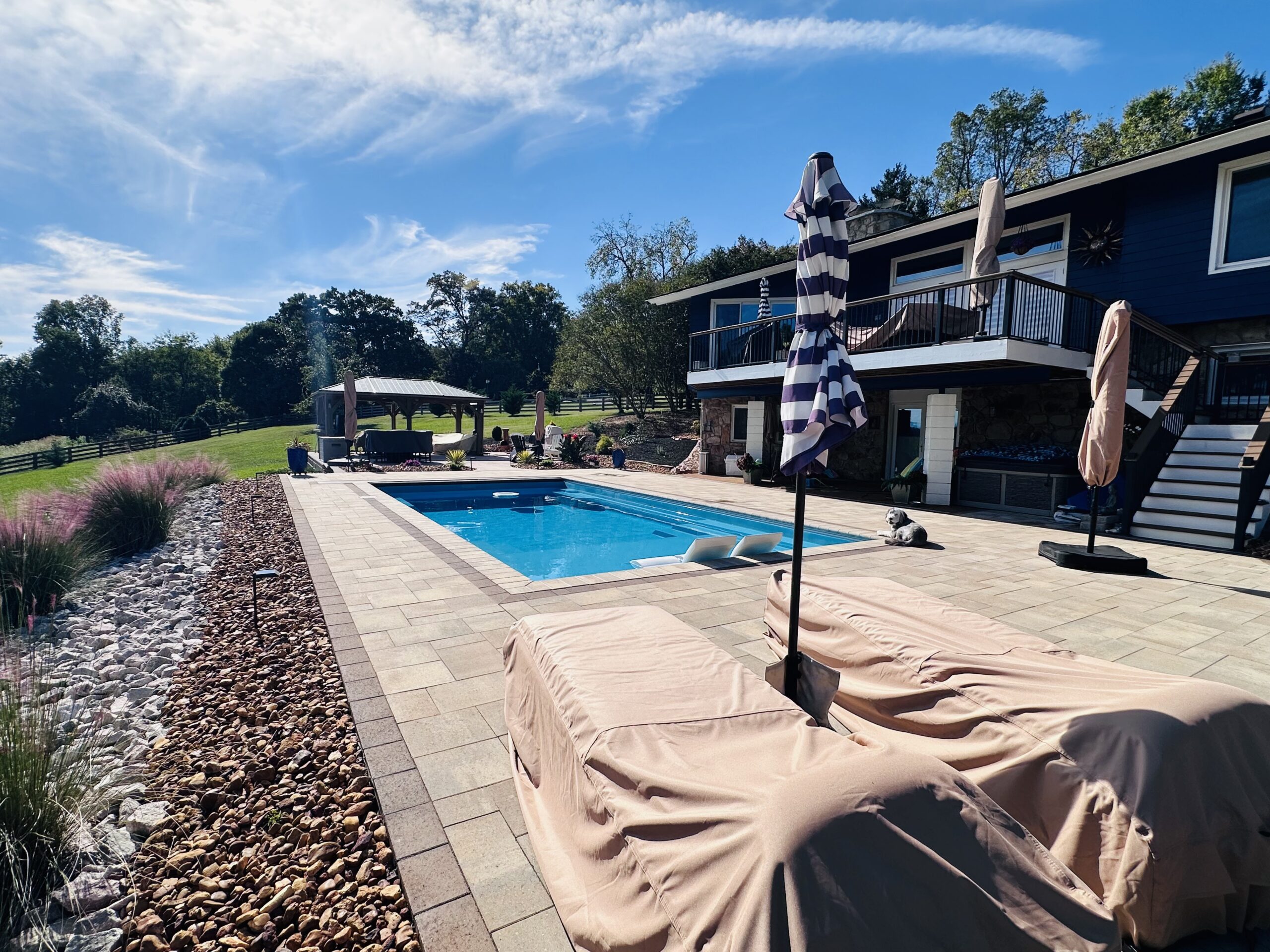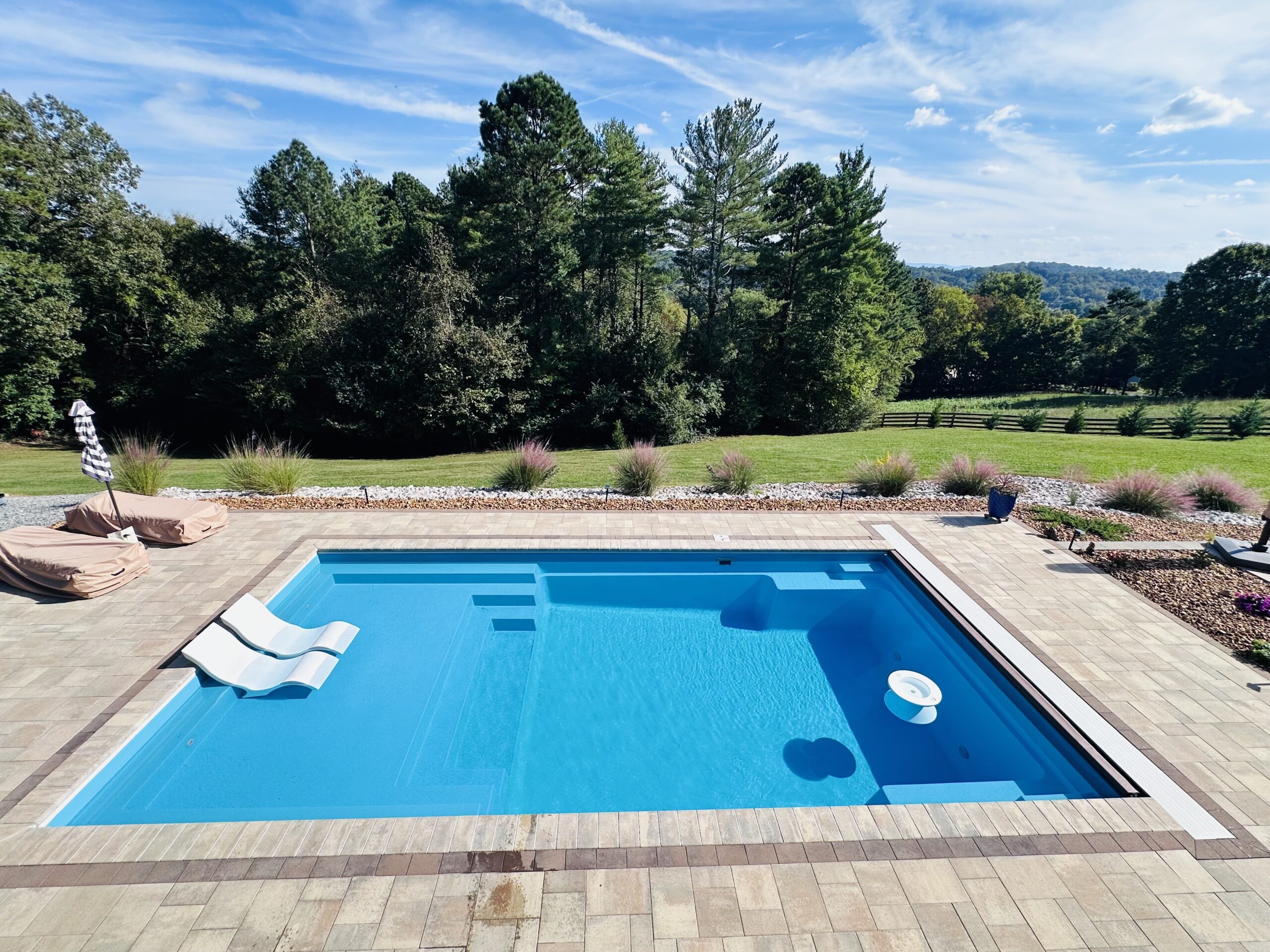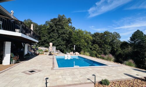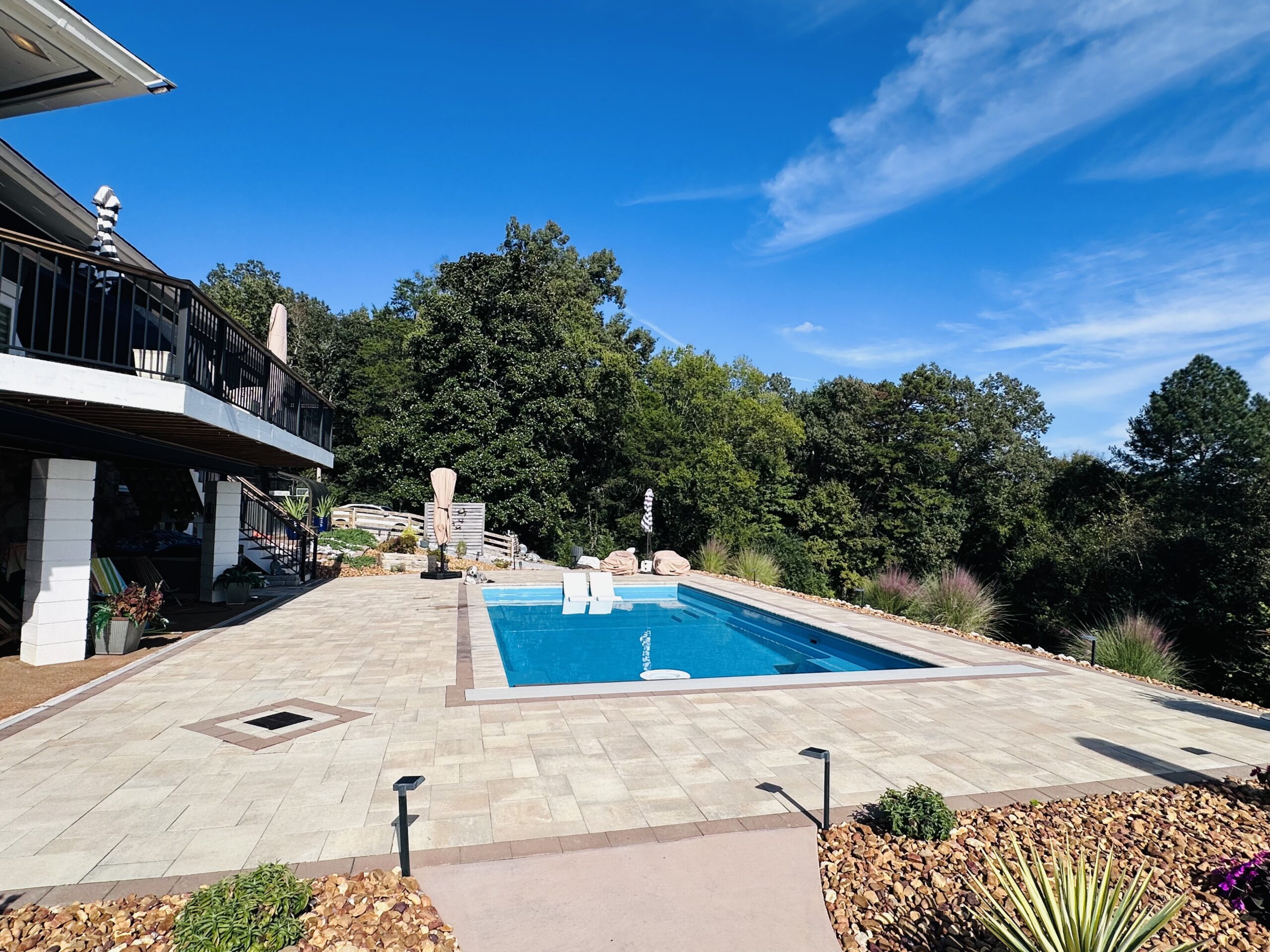 Rectangle – Illusion – 15’6″ x 30′ – Reef Blue by Imagine Pools, Automatic Safety Cover. Belgard coping and pavers in Savannah with a Mocha border.